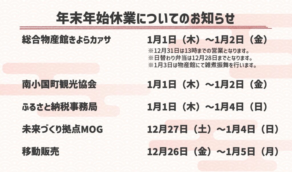 株式会社SMO南小国が運営する、各拠点および事業拠点の年末年始の営業時間をお知らせいたします。